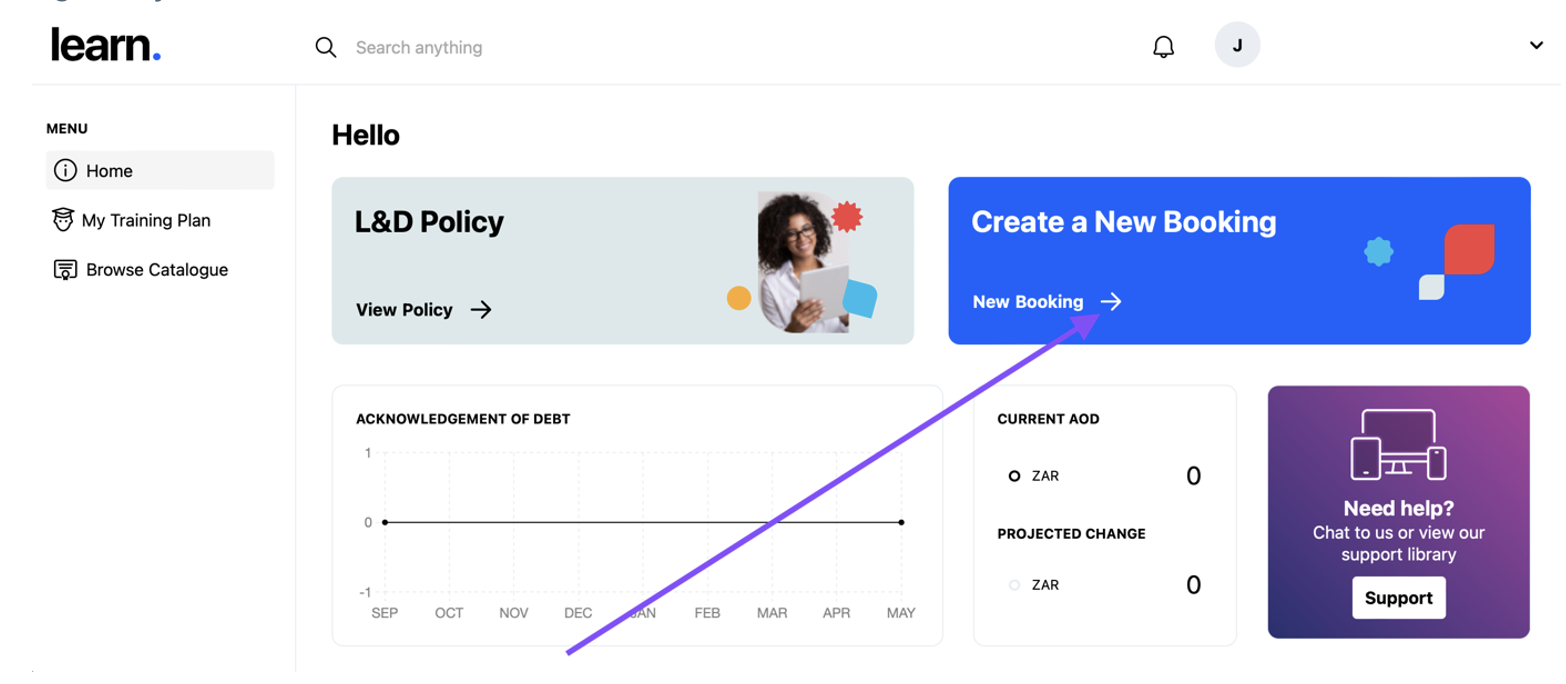 Login to your Learn dashboard and click on the New Booking link in the blue block in the top right of your screen: