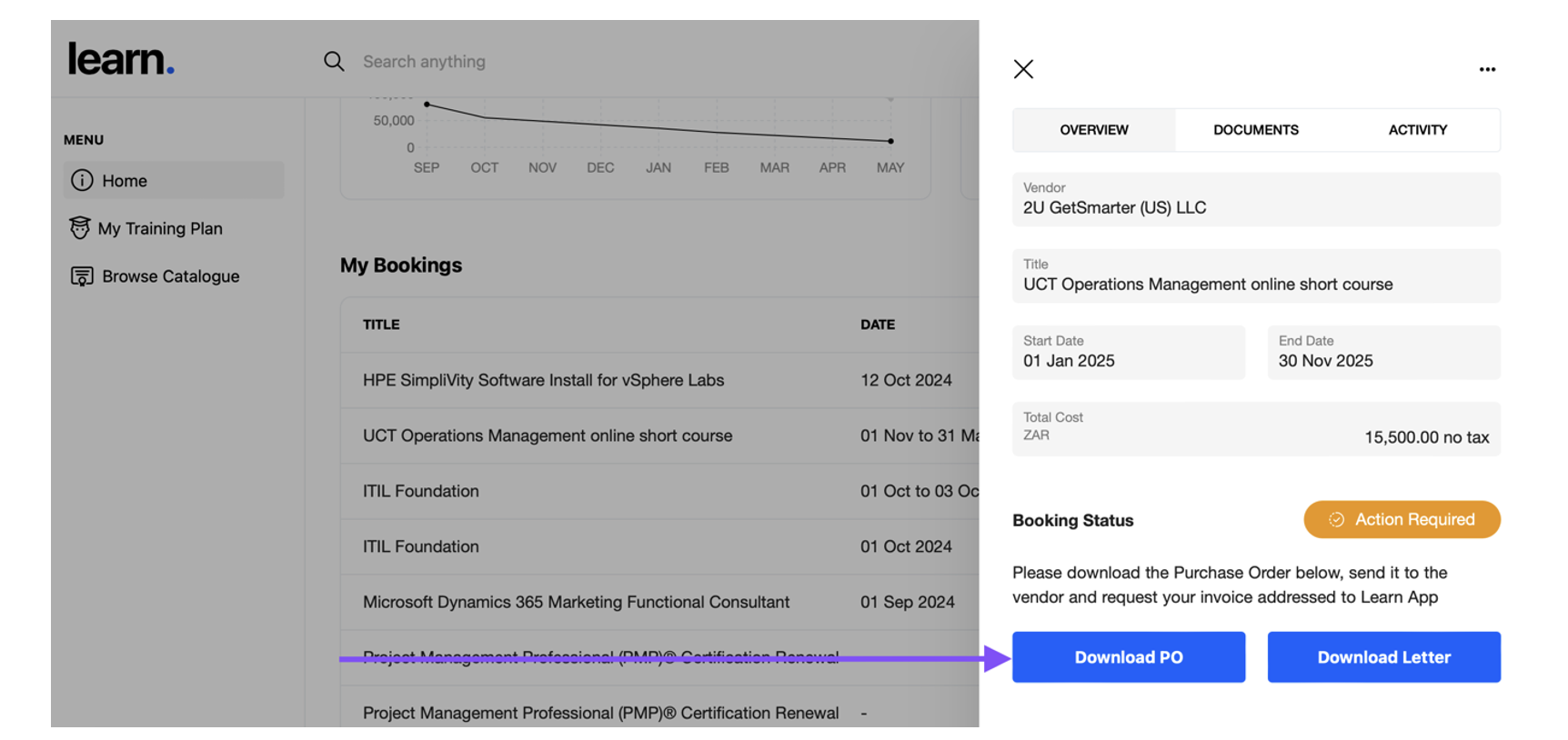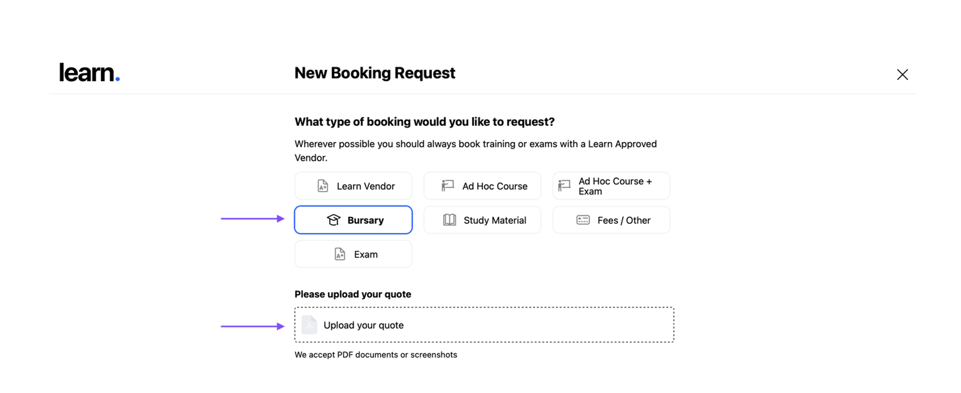 You will be asked to upload a quote from the institution, so please have this ready. The more details on your quote, the less information you will be asked to provide. L&D will compare the booking details to the quote so make sure it is as accurate as possible.