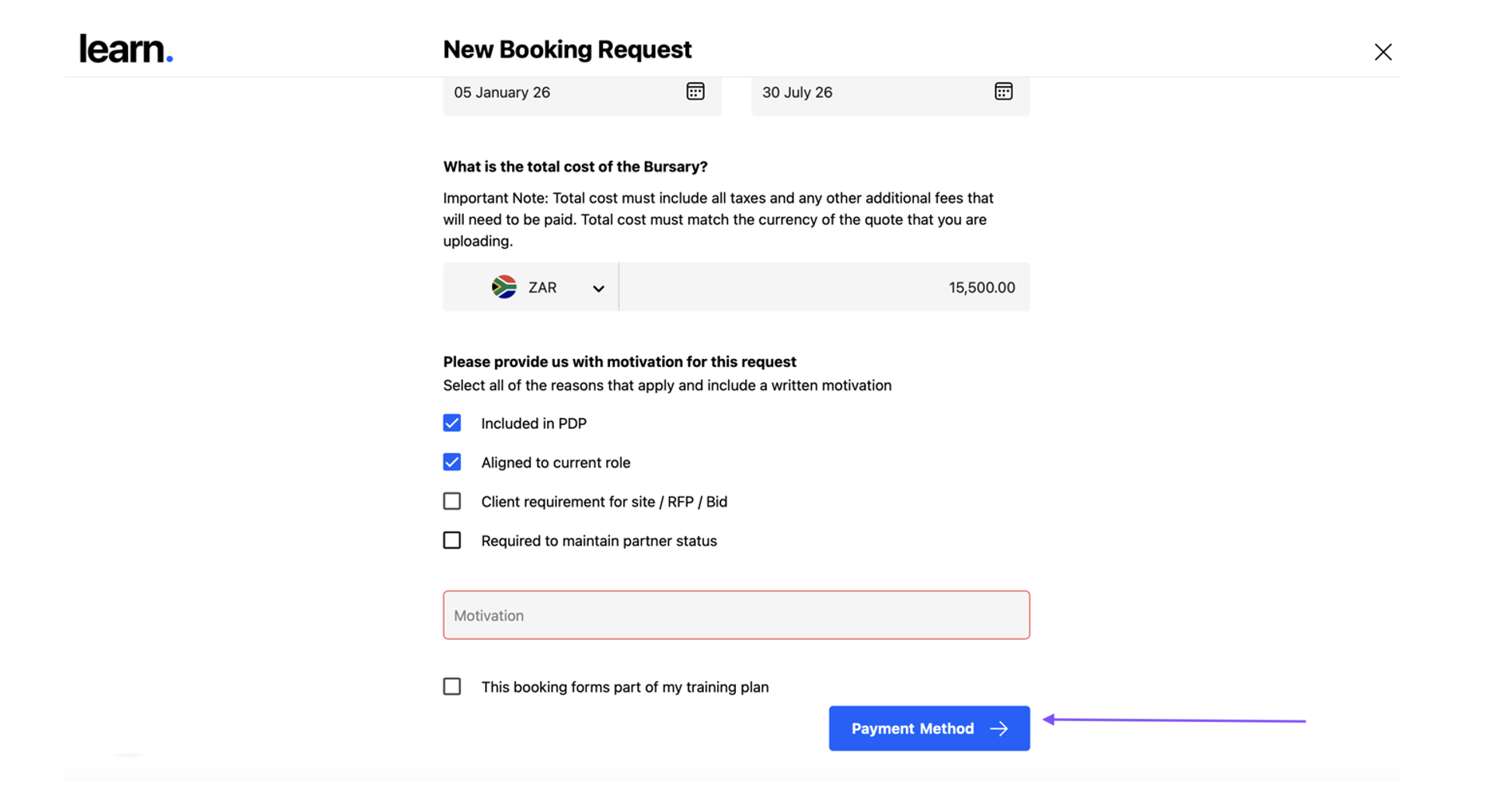 You will now need to confirm the payment method for this booking. Bursaries are typically paid with the Purchase Order method. This payment type is selected by default.