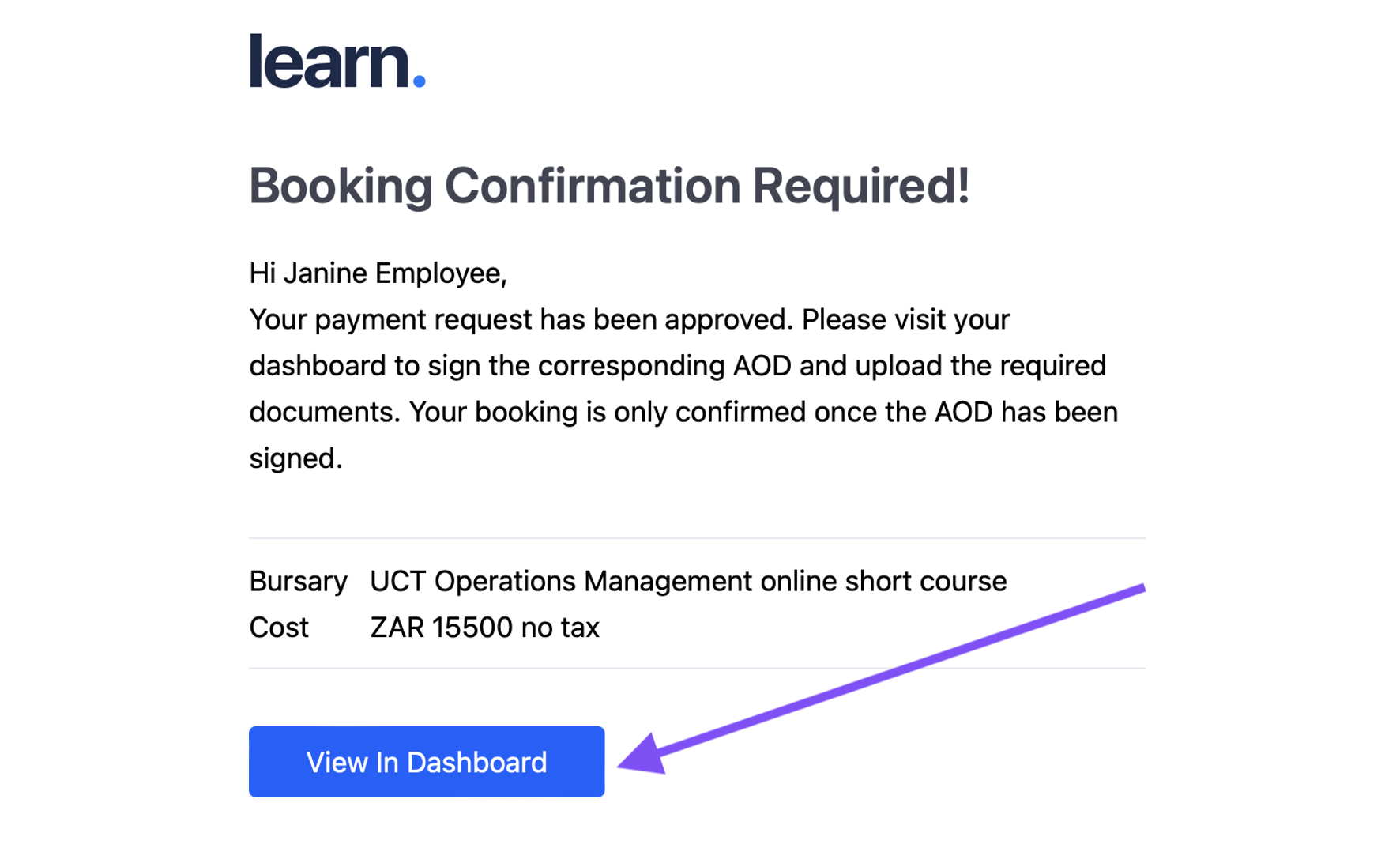 Your Bursary request has now been submitted and is in the approval process with your manager and L&D. You will be notified via email and on your dashboard once these approvals are completed.