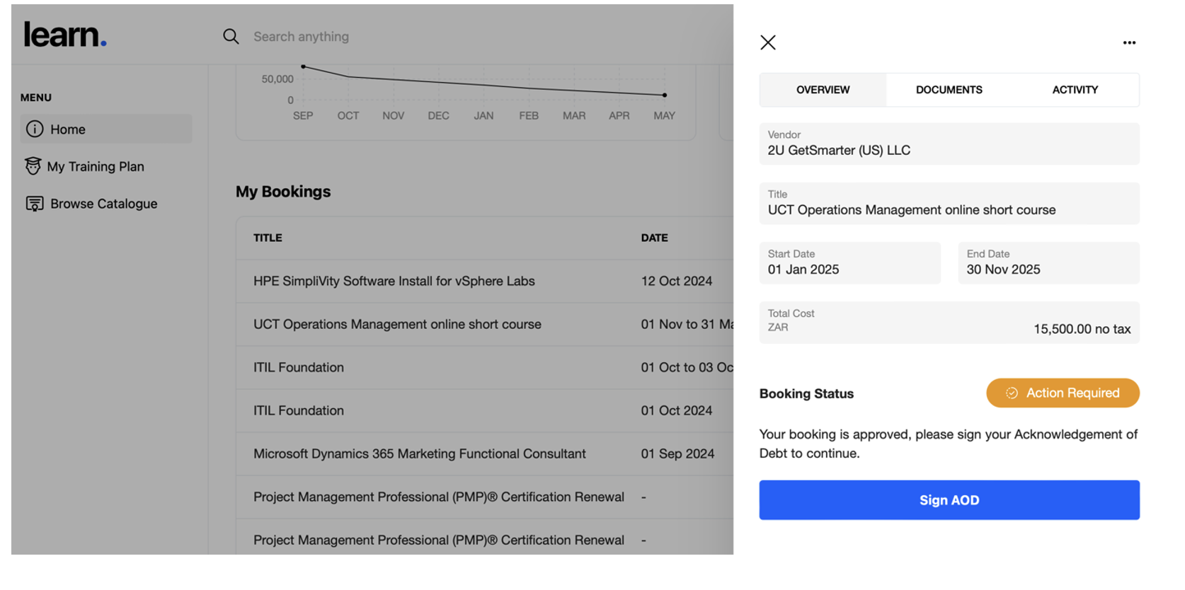 Once L&D has approved the request your next step is to sign the Acknowledgement of Debt. The booking is only confirmed on the system once you have signed the AOD.
