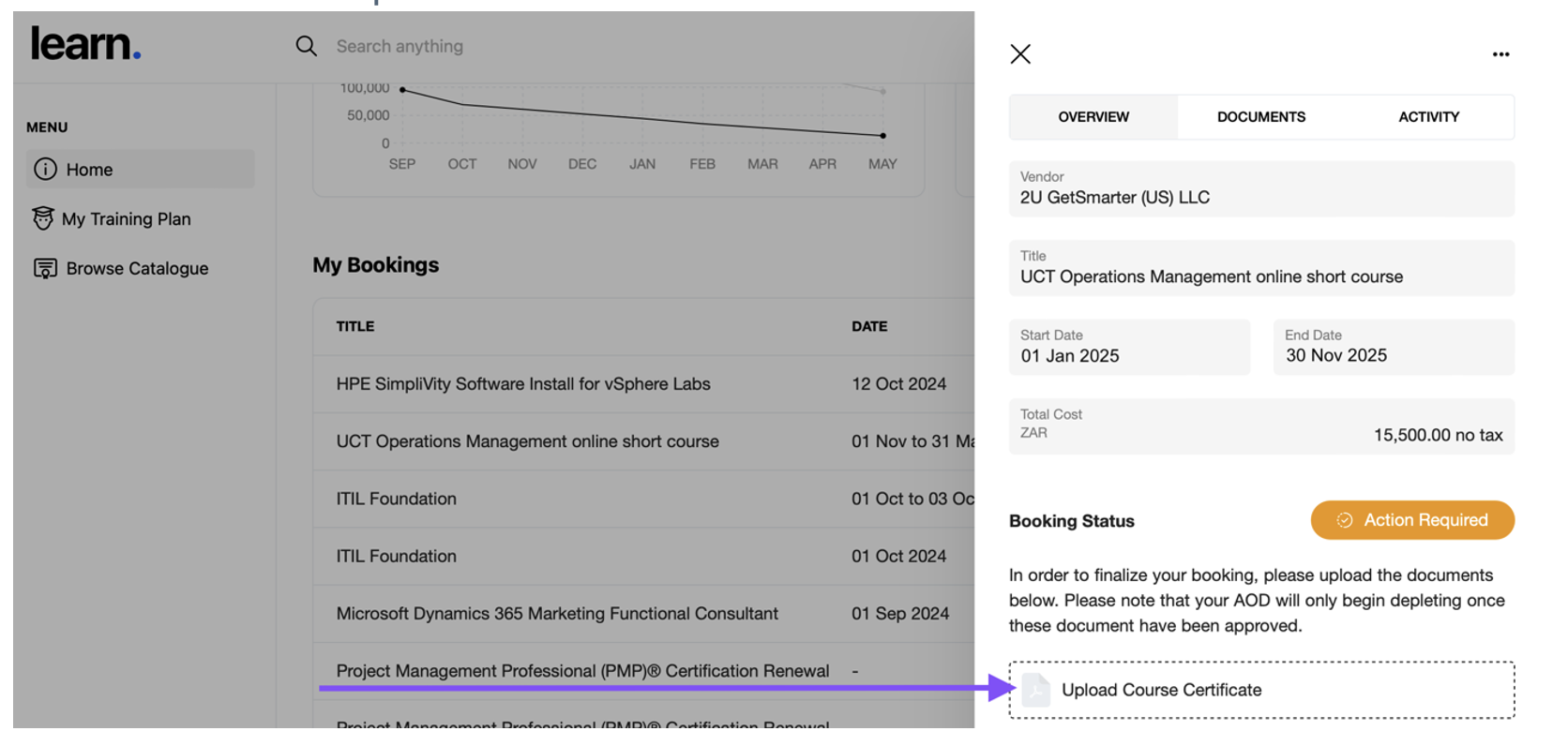 Login to your Learn dashboard and click on the booking in the My Bookings list and then upload the document in the “Upload Course Certificate” field: