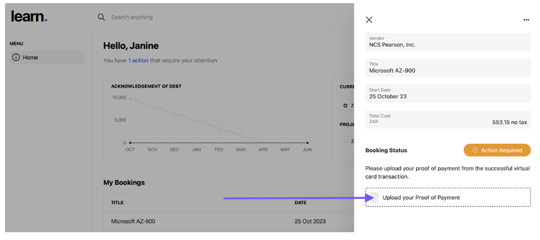 Once you have paid for your booking and received the proof of payment, go back to your booking window and click in the upload field to select the document and upload it: