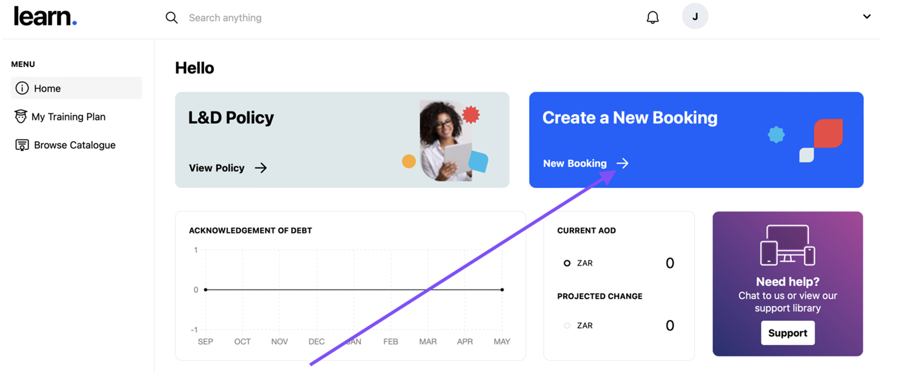 Login to your Learn dashboard and click on the New Booking link in the blue block in the top right of your screen: