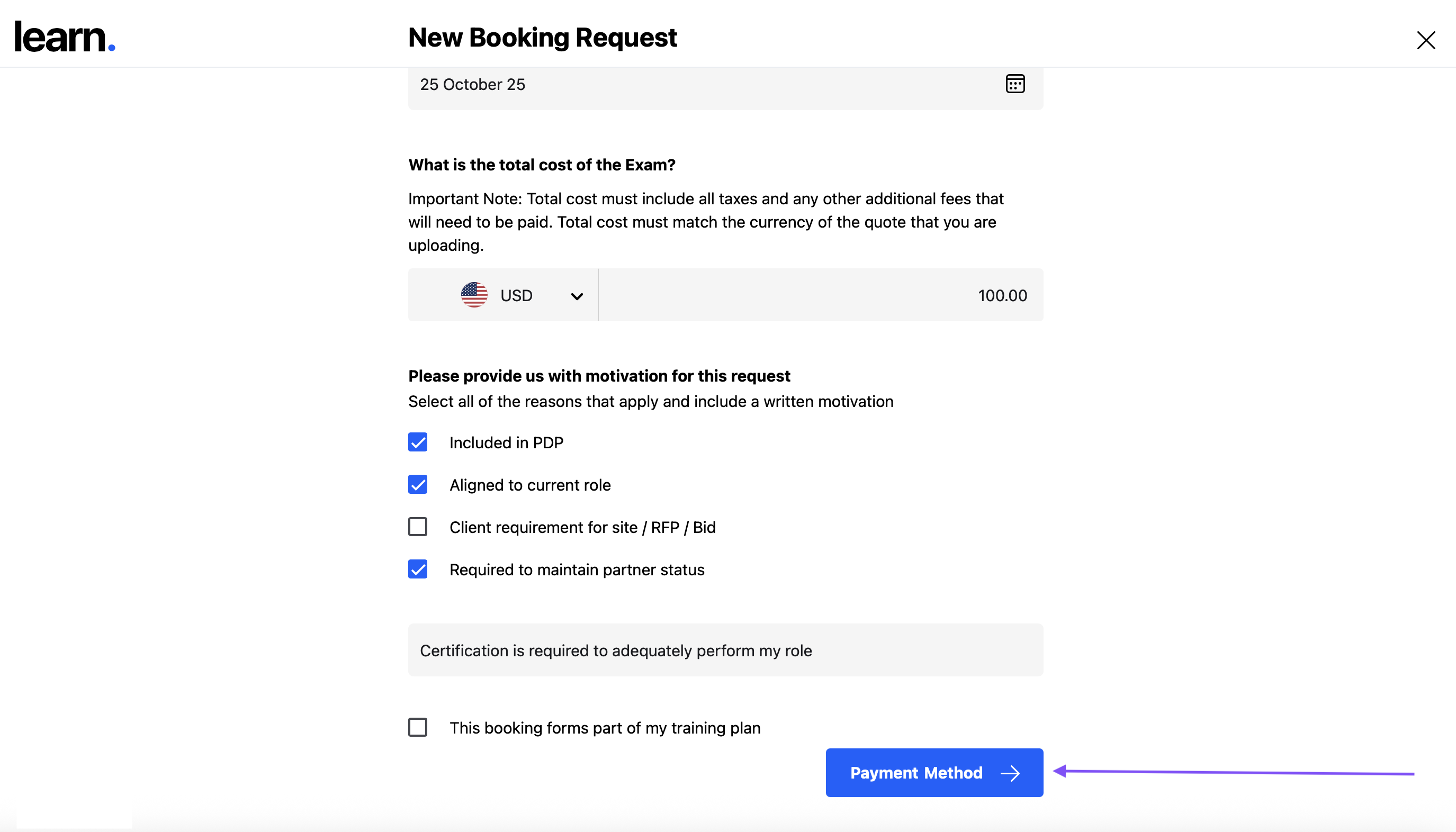 Your request is now submitted for approval, first by your Manager and then by the L&D team. If you submitted a Virtual Credit Card request then there is an additional approval step by the Learn finance team.