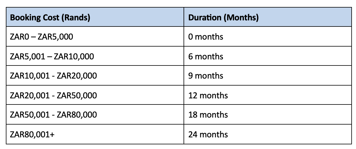 The amount of time it will take for the AOD to fully deplete is determined by the cost of the booking, as outlined in the table below: